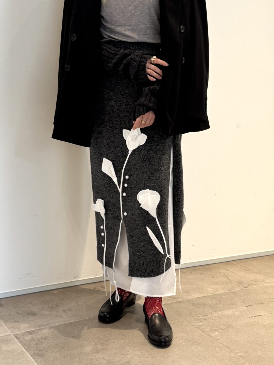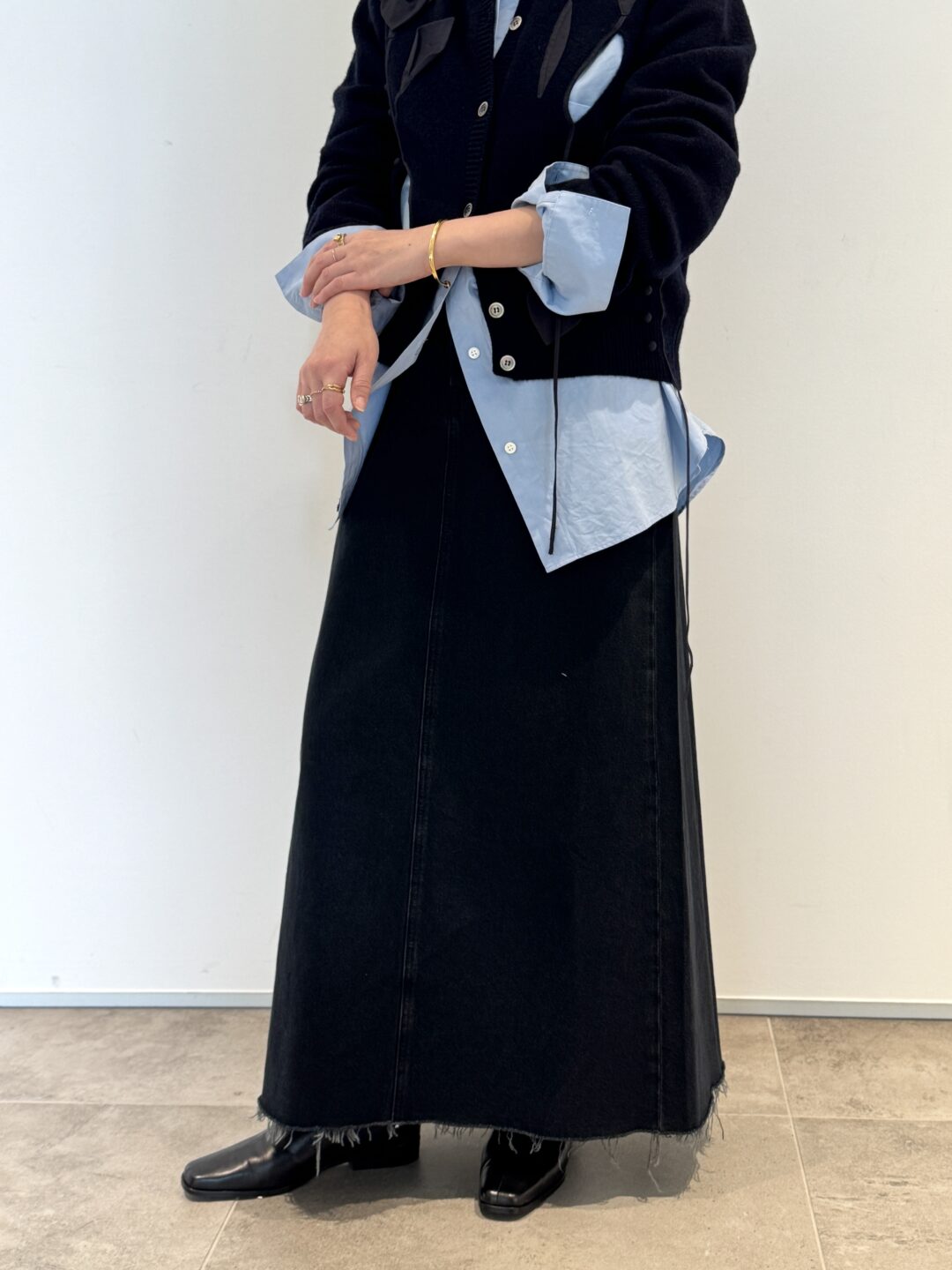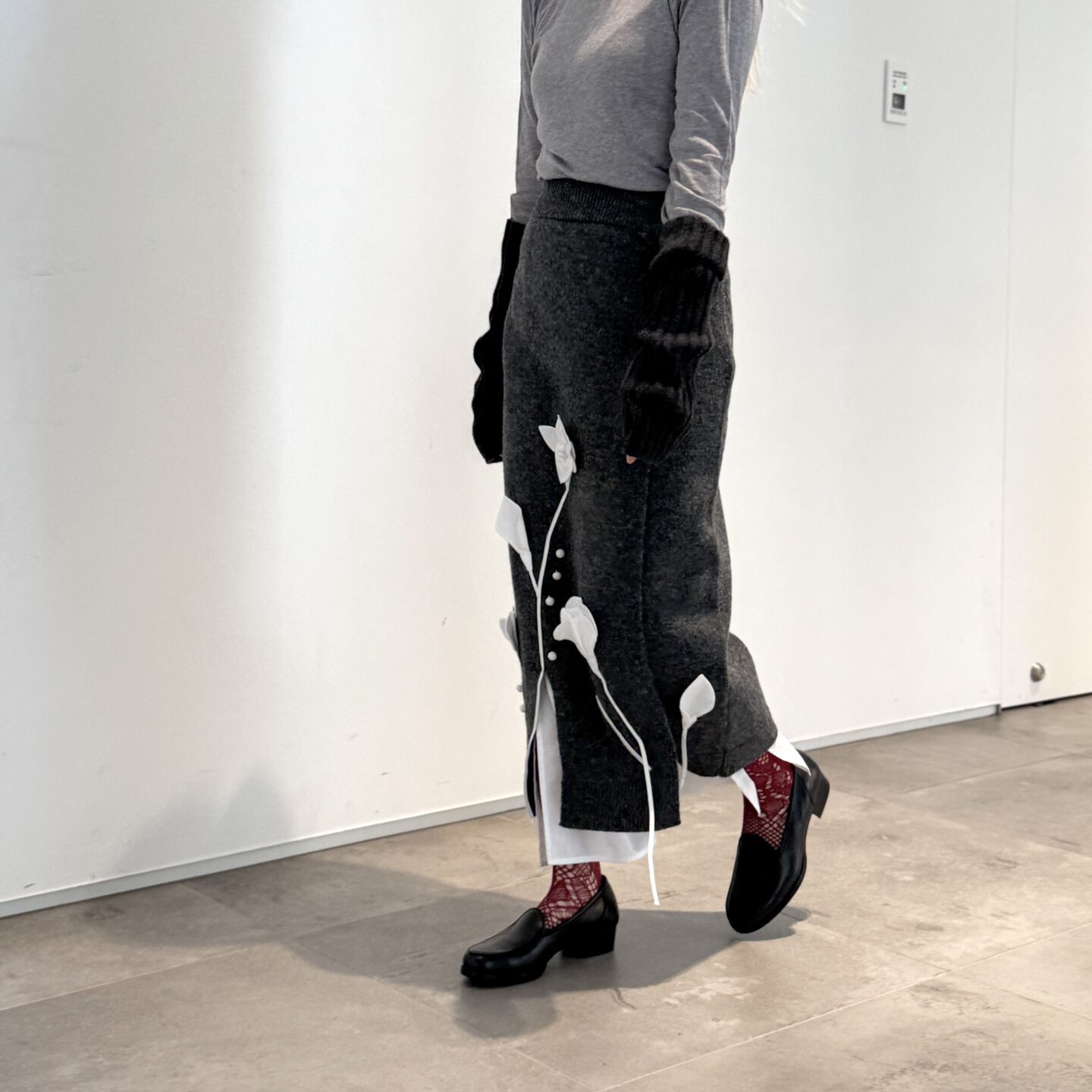 シャツにロングスカートの定番な組み合わせも、RIV NOBUHIKOのデザイン性のあるニットを重ねればいつもと違う雰囲気に。