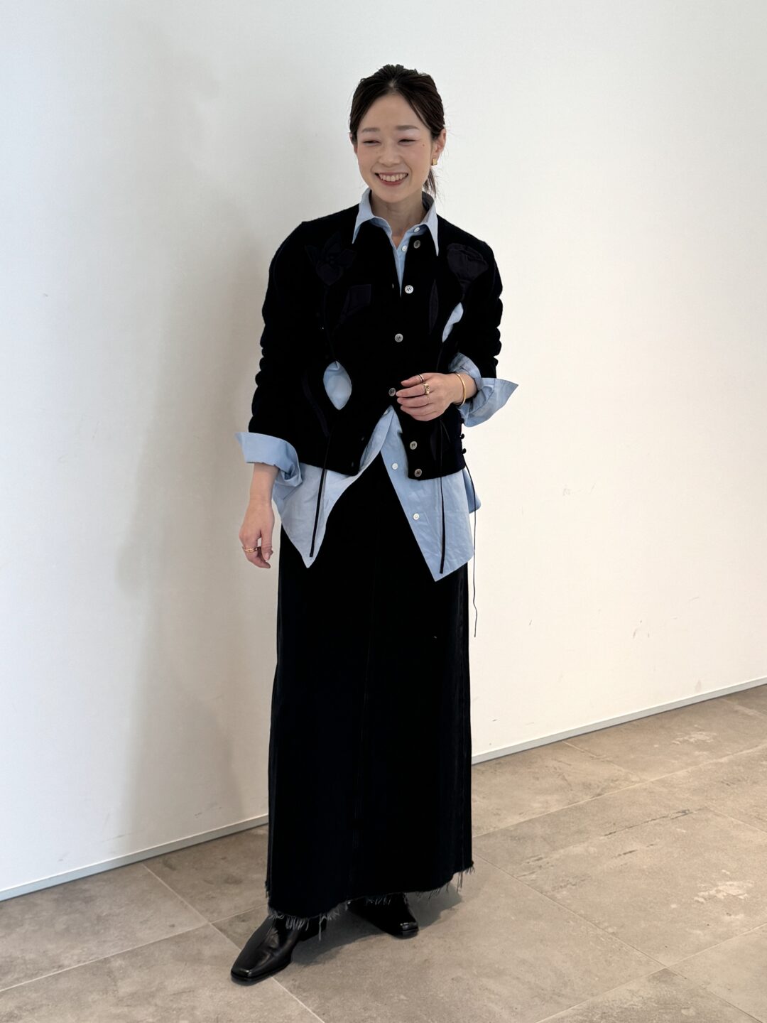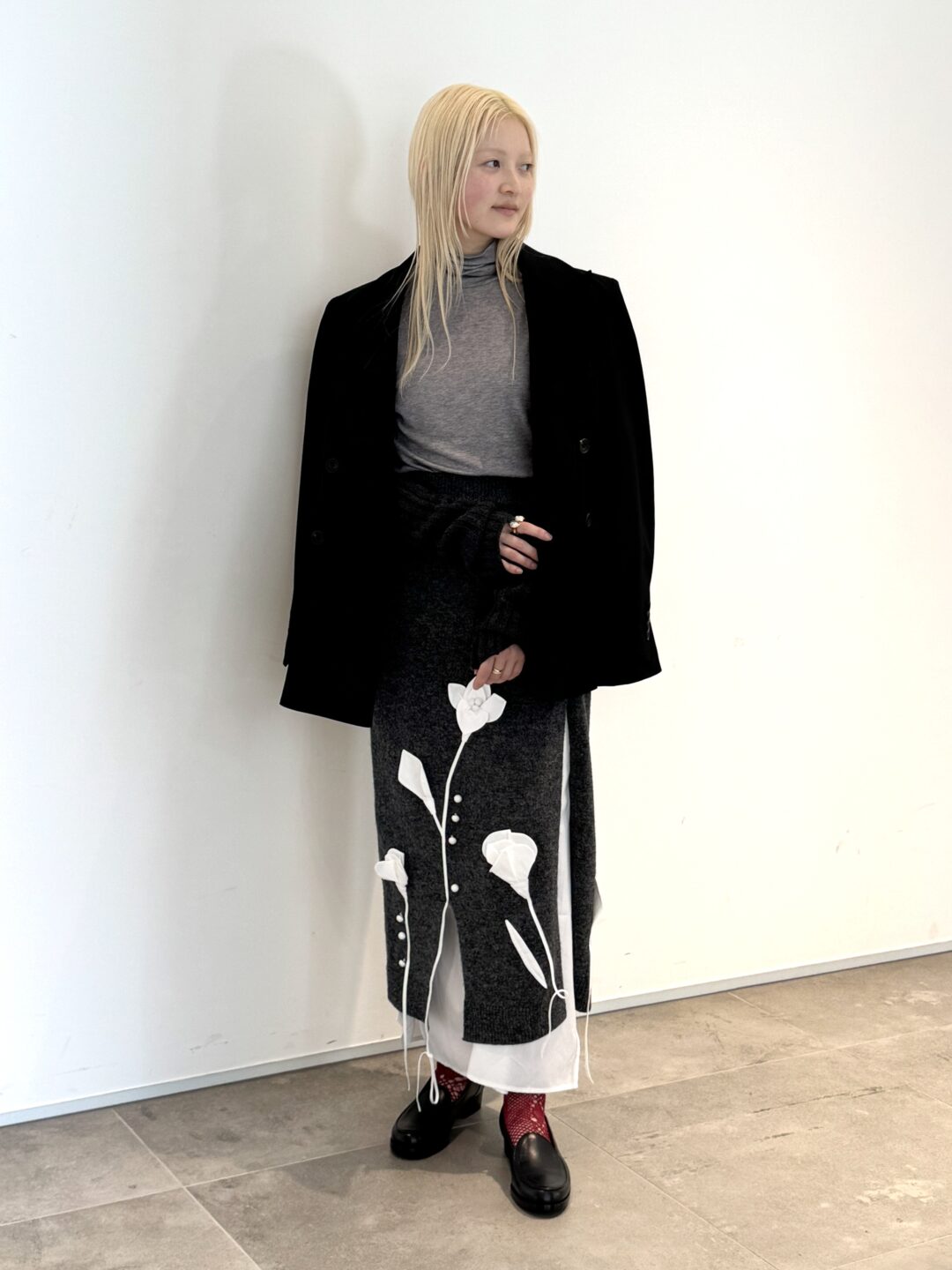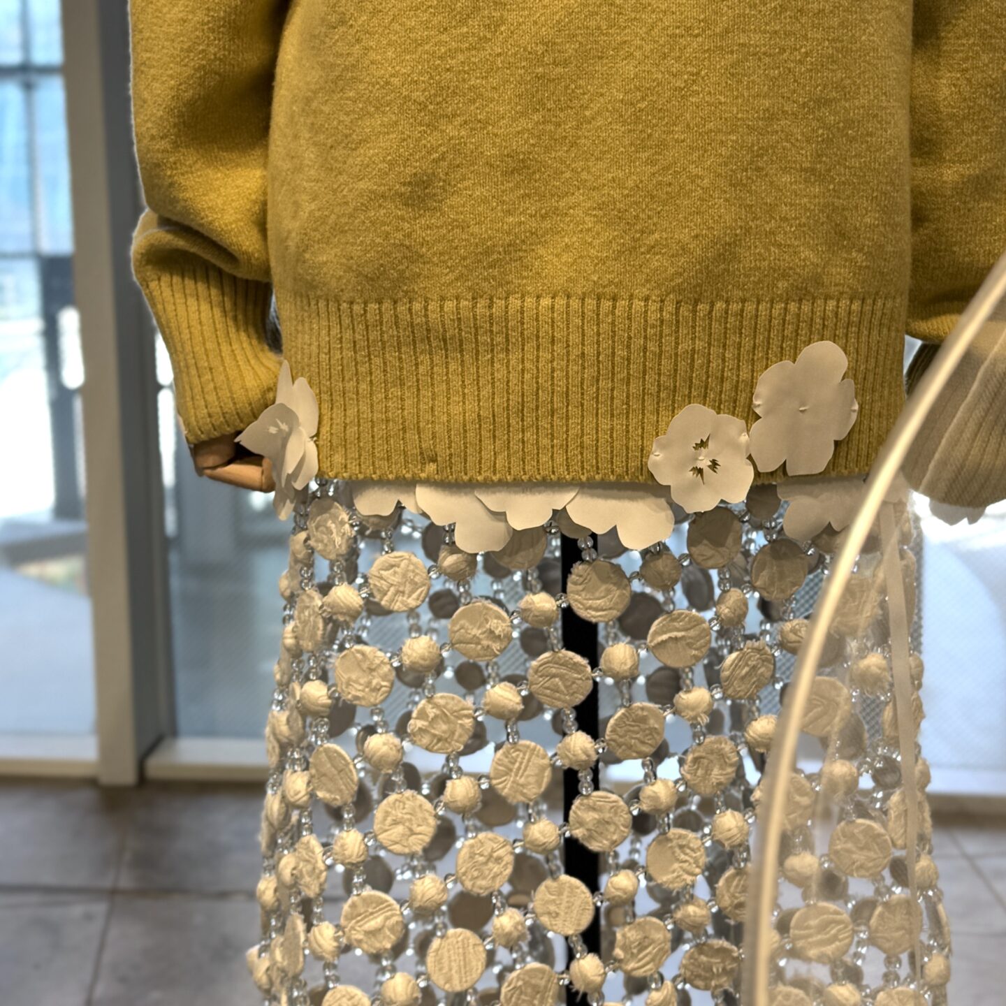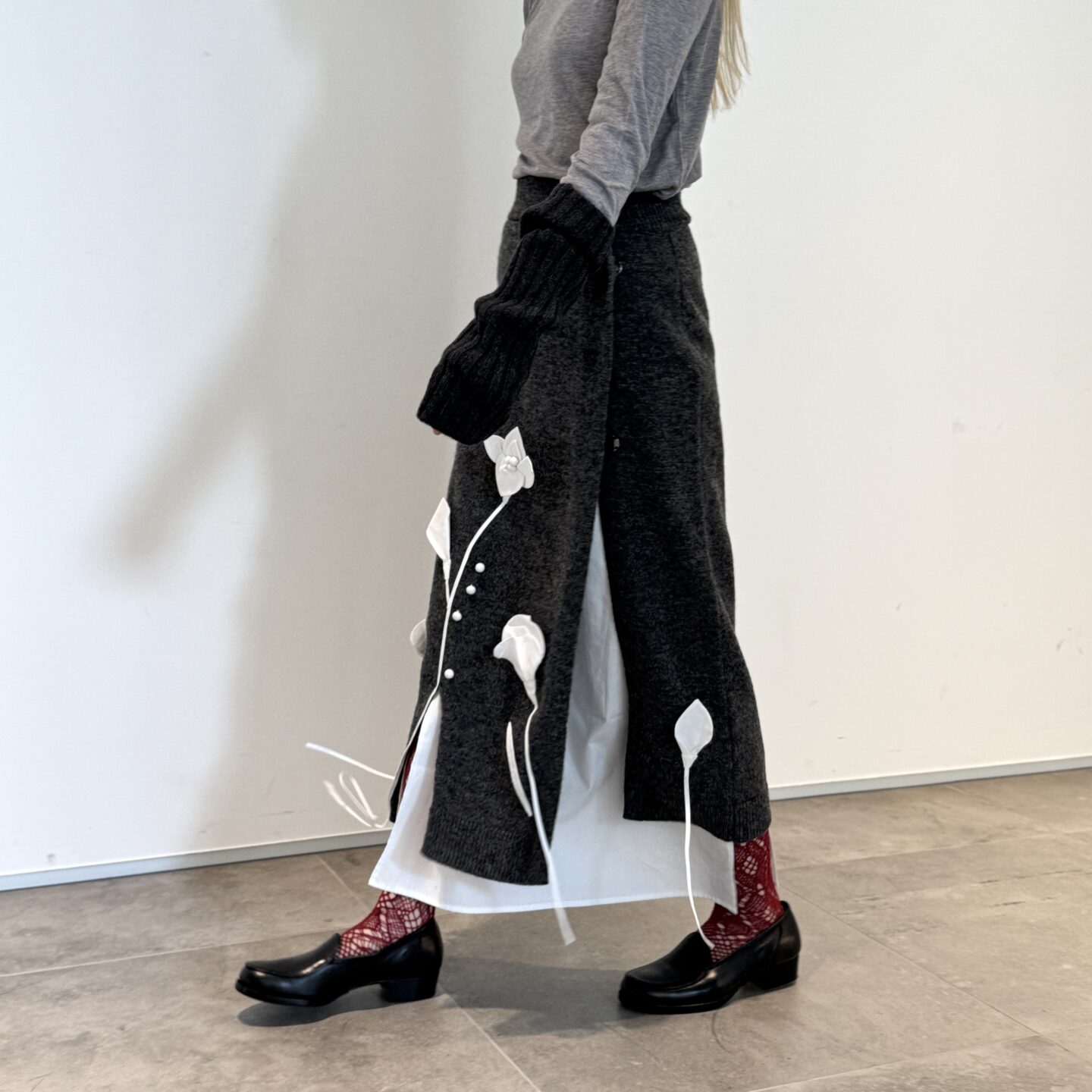 シャツにロングスカートの定番な組み合わせも、RIV NOBUHIKOのデザイン性のあるニットを重ねればいつもと違う雰囲気に。