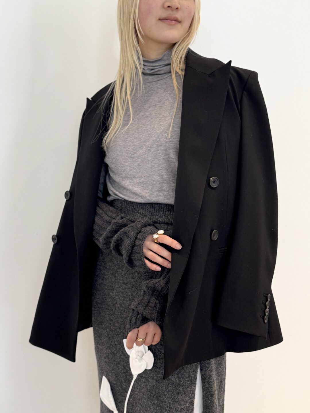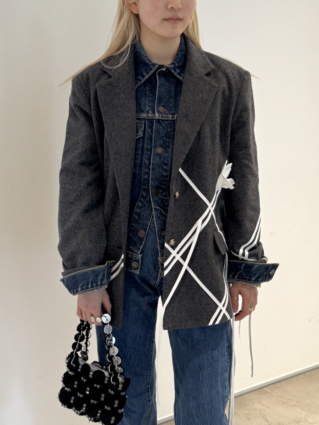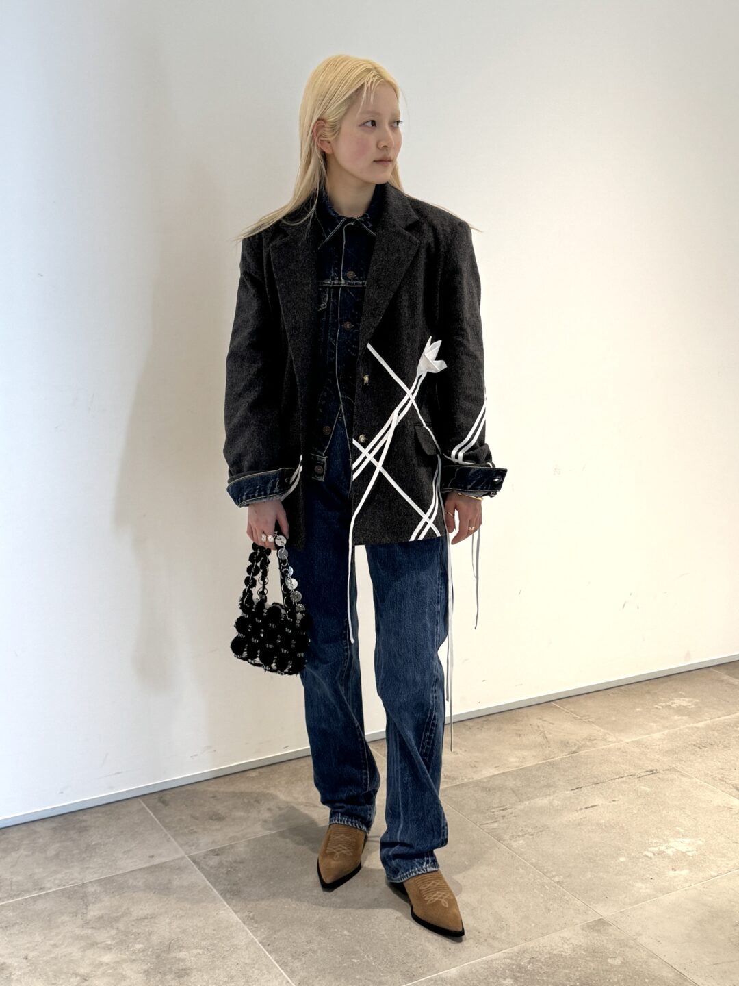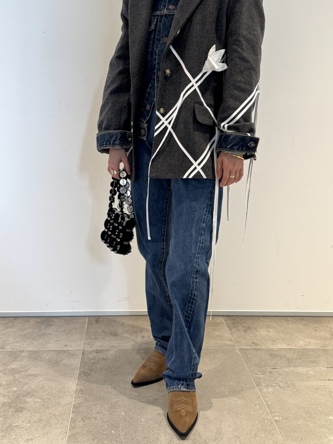 ビンテージのデニムの上下と合わせて、カジュアルダウン。綺麗なRIV NOBUHIKOのジャケットを敢えて崩したスタイリングに。
