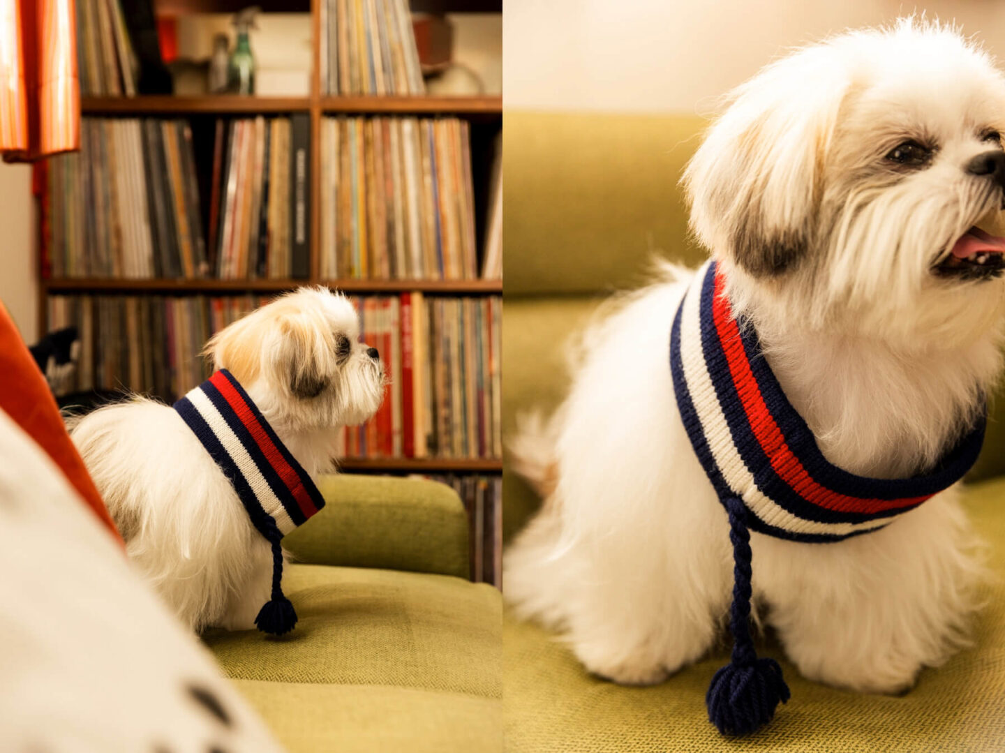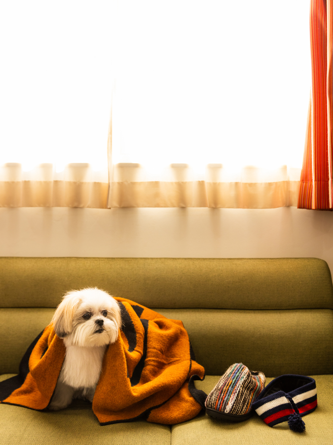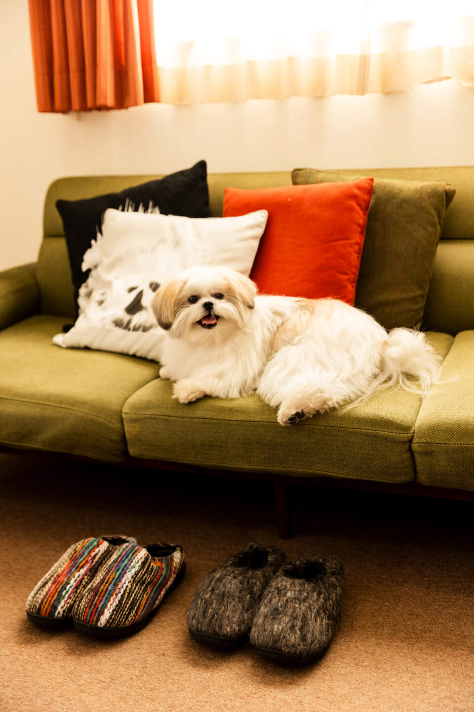 ソファの上でくつろぐモコゾウと、〈スブ〉のあったかサンダル。立体的な編み模様が温もりを演出する多色使いのデザインや、モヘア調のウール素材で静かな存在感を放つグレーカラーなど、バリエーションもさまざま。どちらも足を包み込むやさしい履き心地で、ワンマイルのお出かけにも最適。モコモコ仲間のモコゾウも、思わずウトウト……。