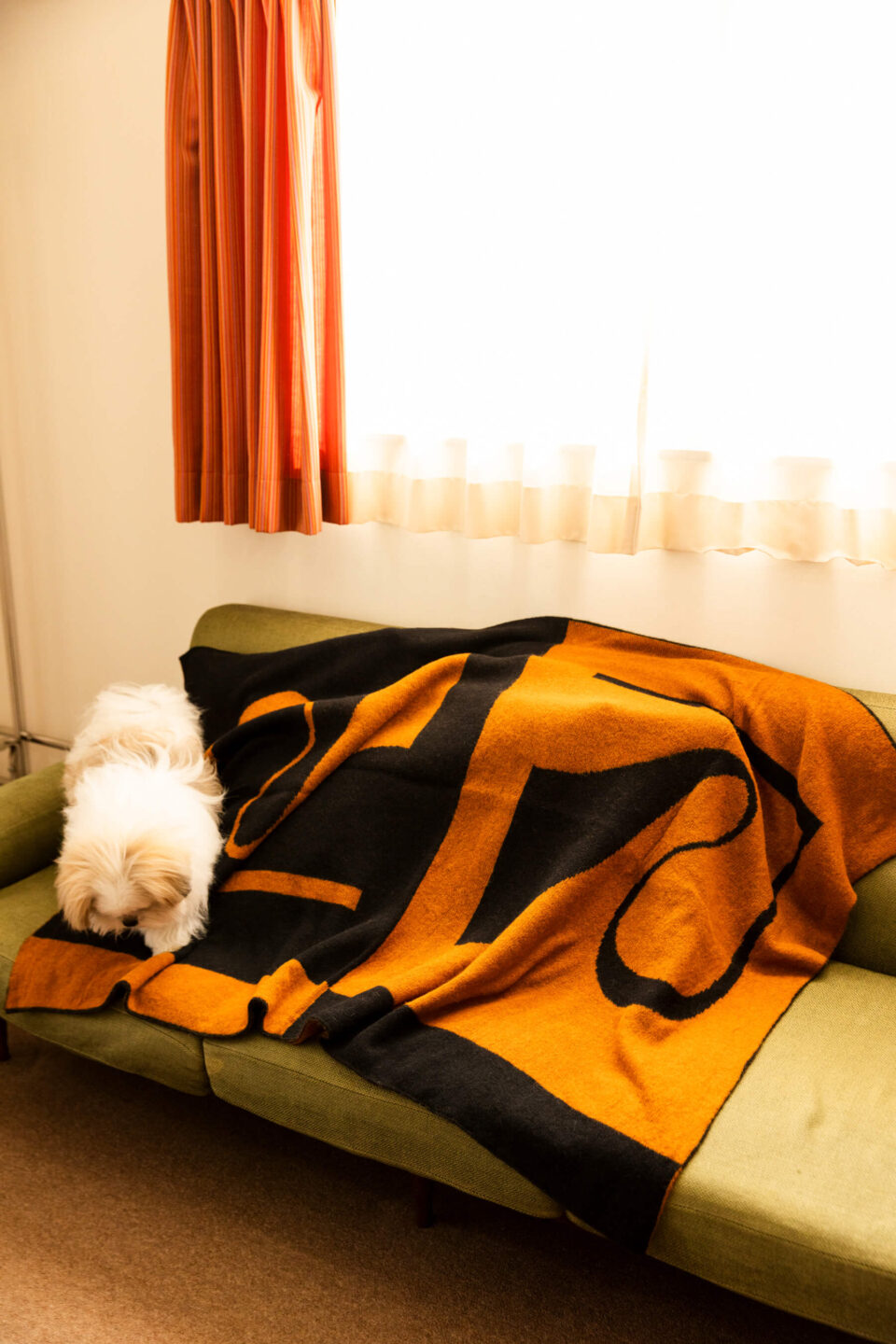 とろんと体を覆うブランケットは、ソファに置いておくだけで部屋の空気まで柔らかくしてくれる。ブラック×ブリックカラーの大胆なグラフィックに反して、触れた瞬間にわかるぬくもりのある質感。とにかく大判なので、羽織る、掛ける、敷く…と使い道も自由自在。朝のひととき、ぼんやり空を浴びながらくるまるのが最高の時間になるはず。