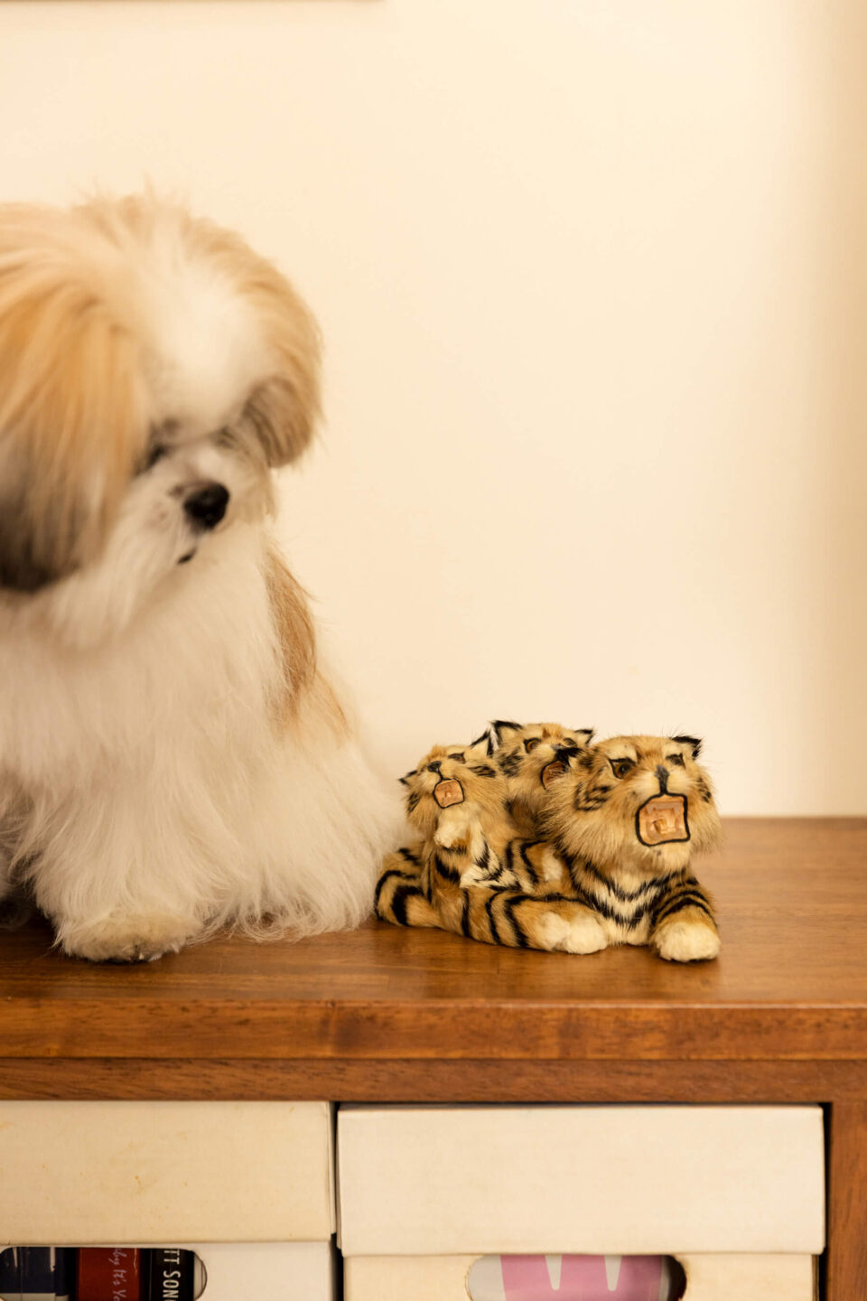 ふわふわの毛並みとちょこんとした佇まいが愛らしい、虎ノ門にちなんだ“三つ子虎”のオブジェ。鋭い眼差しのはずが、どこかユルくてにくめない顔立ち。シュールさと可愛さの絶妙なバランスは、インテリアのワンポイントにも、ユーモアを贈るクリスマスギフトにもぴったり。あまりの愛らしさに、モコゾウも思わず見入ってしまうほど。