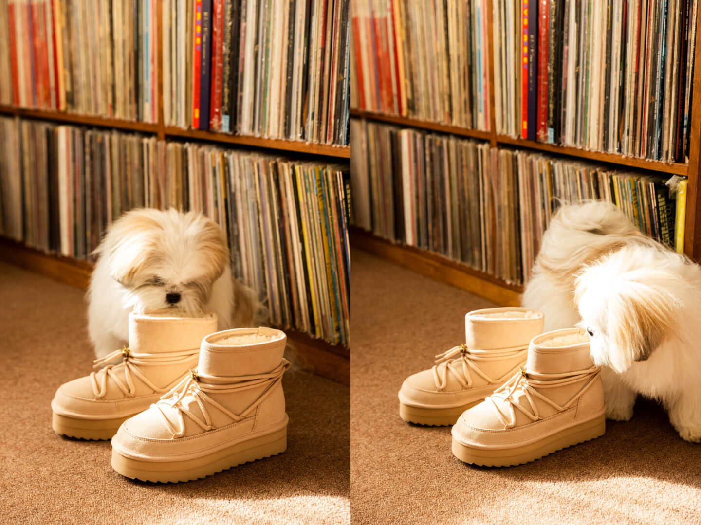 〈COLORS OF CALIFORNIA〉のムートンブーツは、シューレースを巻きつけたようなユニークなデザインと、ころんとした丸みのあるフォルムが魅力。ボリューミーなのに軽量で歩きやすさも兼ね備えている。ぬくもりをまとったお洒落が、この一足からはじまりそう。ブーツの中をのぞき込むモコゾウと一緒にパチリ。