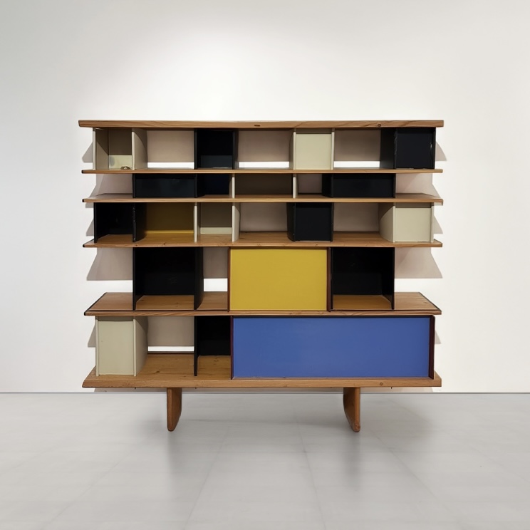O「モダンデザインの母Charlotte Perriand(シャルロット・ペリアン)の1952年頃の代表作Mexique(メキシコ)です!モダン家具をコレクションしていく中で最終到達地点として存在する作品です。Charlotte Perriandが京都に行った際、桂離宮で違い棚を目にし、規格化された伝統的日本建築に影響を受けデザインされたBookShelf。グラフィック且つ機能的で、インテリアに独特の個性を出すことができ、空間が演出され想像が掻き立てられますね。見事な作品です。」