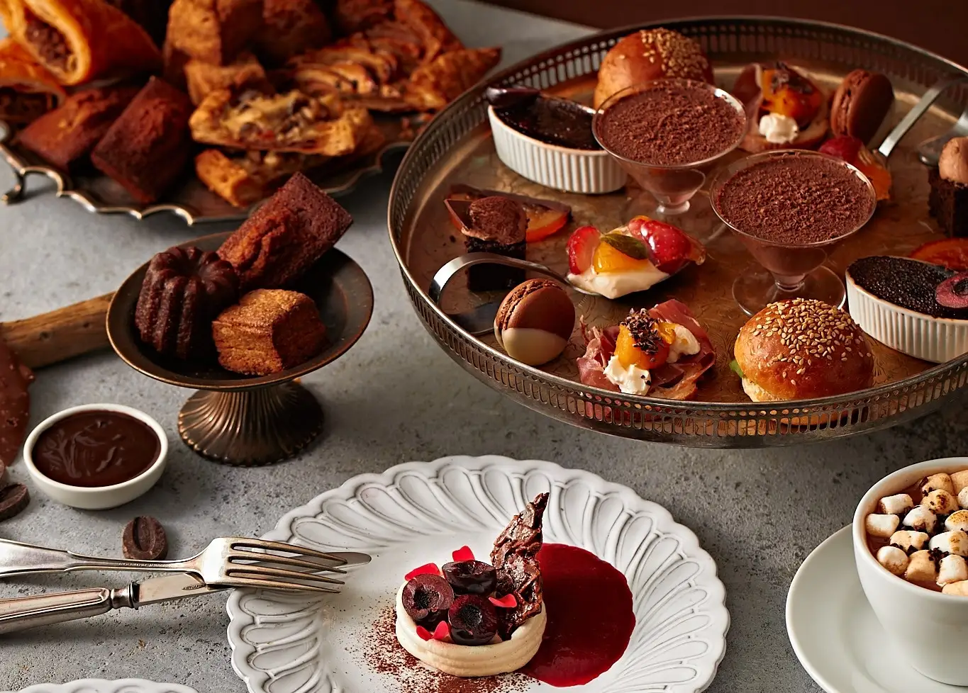 人気のフィナンシェやカヌレを含む焼菓子ベイクワゴンには、オーガニックショコラディップとともにお愉しみください。