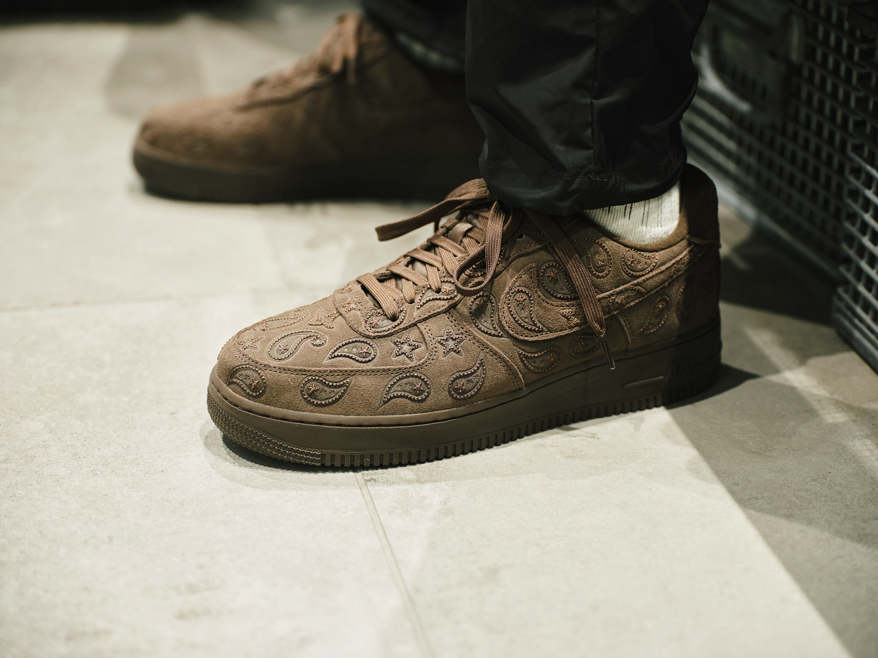 三田「僕は扁平足で甲も高いので、ゆとりのある〈ナイキ〉の《エアフォースワン》が合っていて、昔からよく履いています。今日のモデルはペイズリー柄に一目惚れ。最近は茶色にハマりすぎて、その色ばかり見てしまいます」