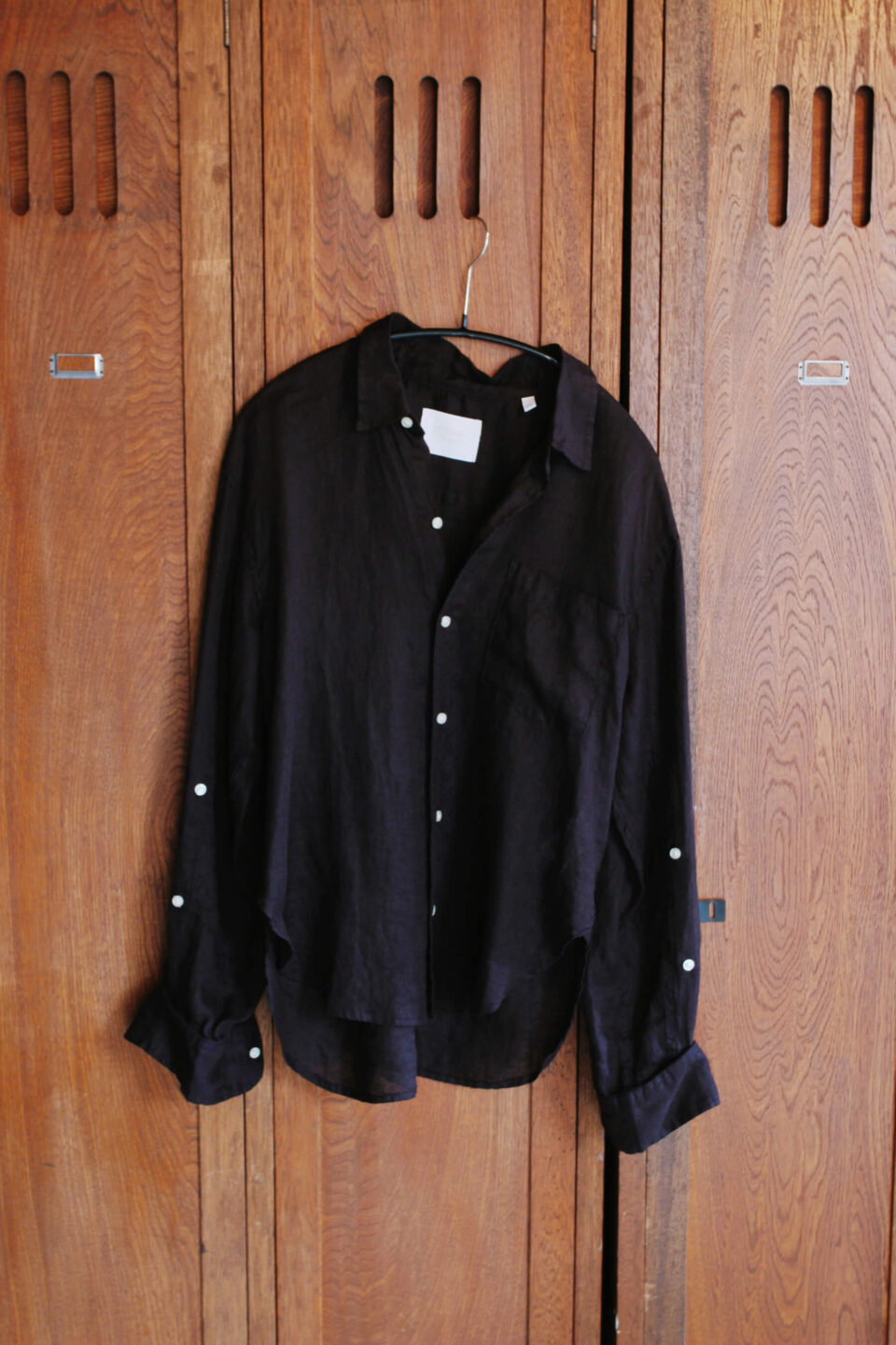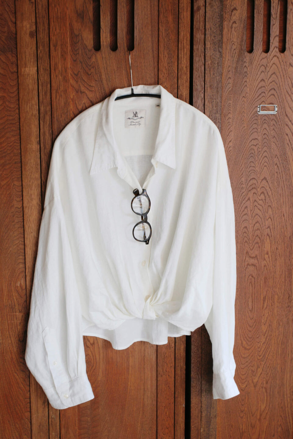 ロサンゼルス発〈シチズンズオブヒューマニティ〉による、柔らかく軽いリネンで仕立てたチョコレート色が大人な一着。袖に配されたボタンで丈やシルエットを変化させて。48,400円(CITIZENS OF HUMANITY) アメリカントラッドブランドで経験を積んだデザイナー、クリス・レバによるNY発〈R13〉のセカンドラインとしてベルギーでスタートした〈デミニスト〉。リネンコットン素材が空気をはらみ、裾を前で結んだようなクロップドシルエットやドロップショルダーの丸みのあるシルエットが程よい抜け感に。ヘルシーな肌見せやレイヤードを楽しんで。シャツ57,200円(DENIMIST)、メガネ59,400円(GLASSES)