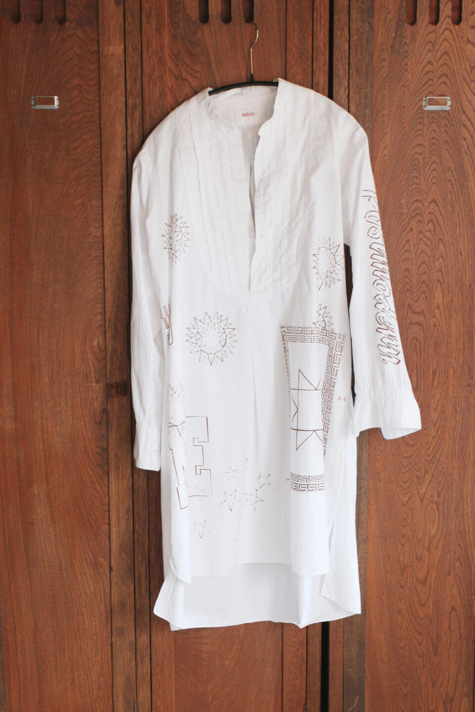 〈THENIME〉のコンセプター長尾悦美氏と親交の深いグラフィックアーティスト村上周氏とのコラボレーション企画で生まれた一点もの。パリの蚤の市で見つけた1930年代〜40年代のレディースのパジャマに、アートプリントをコラージュした。66,000円(AMANE MURAKAMI)