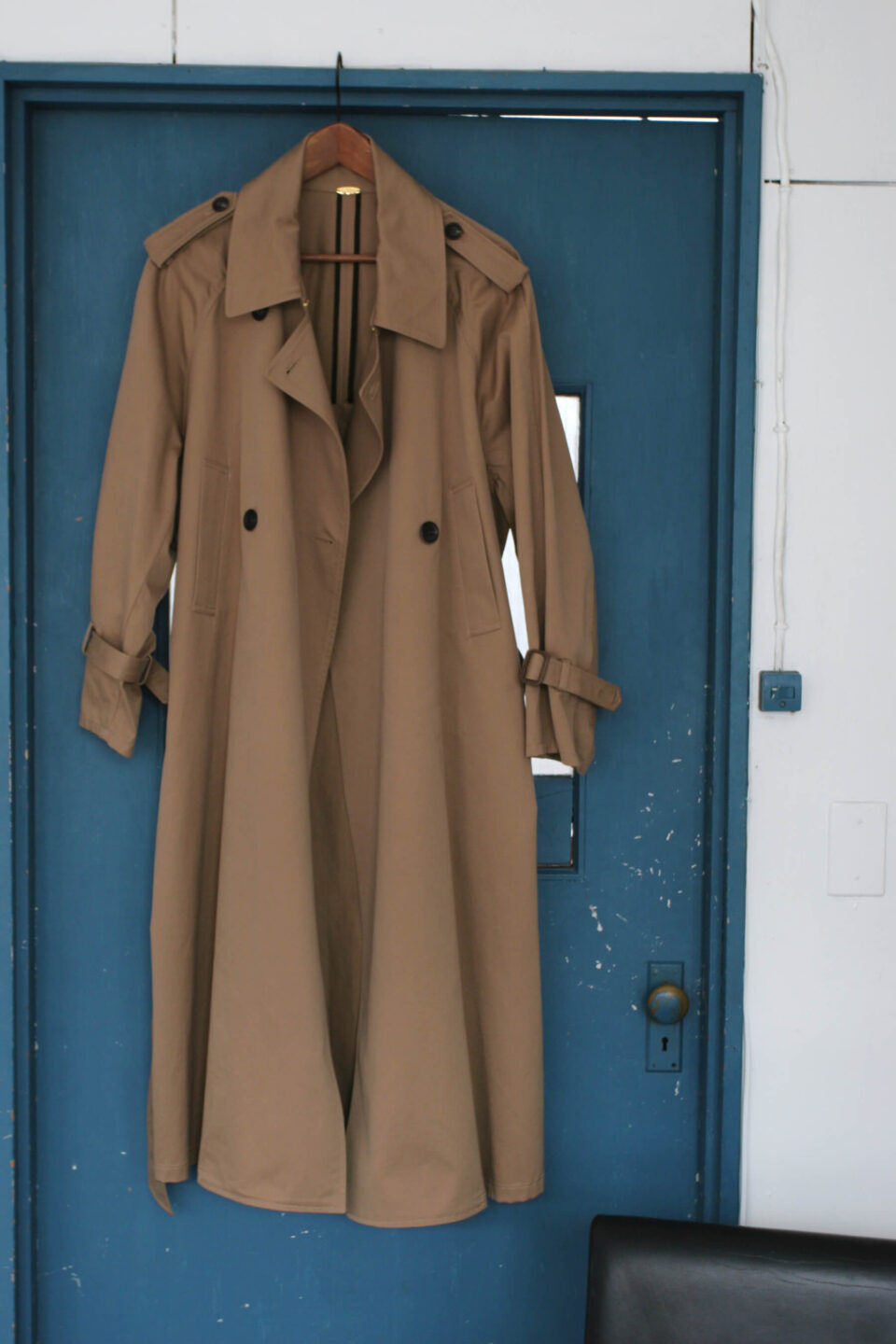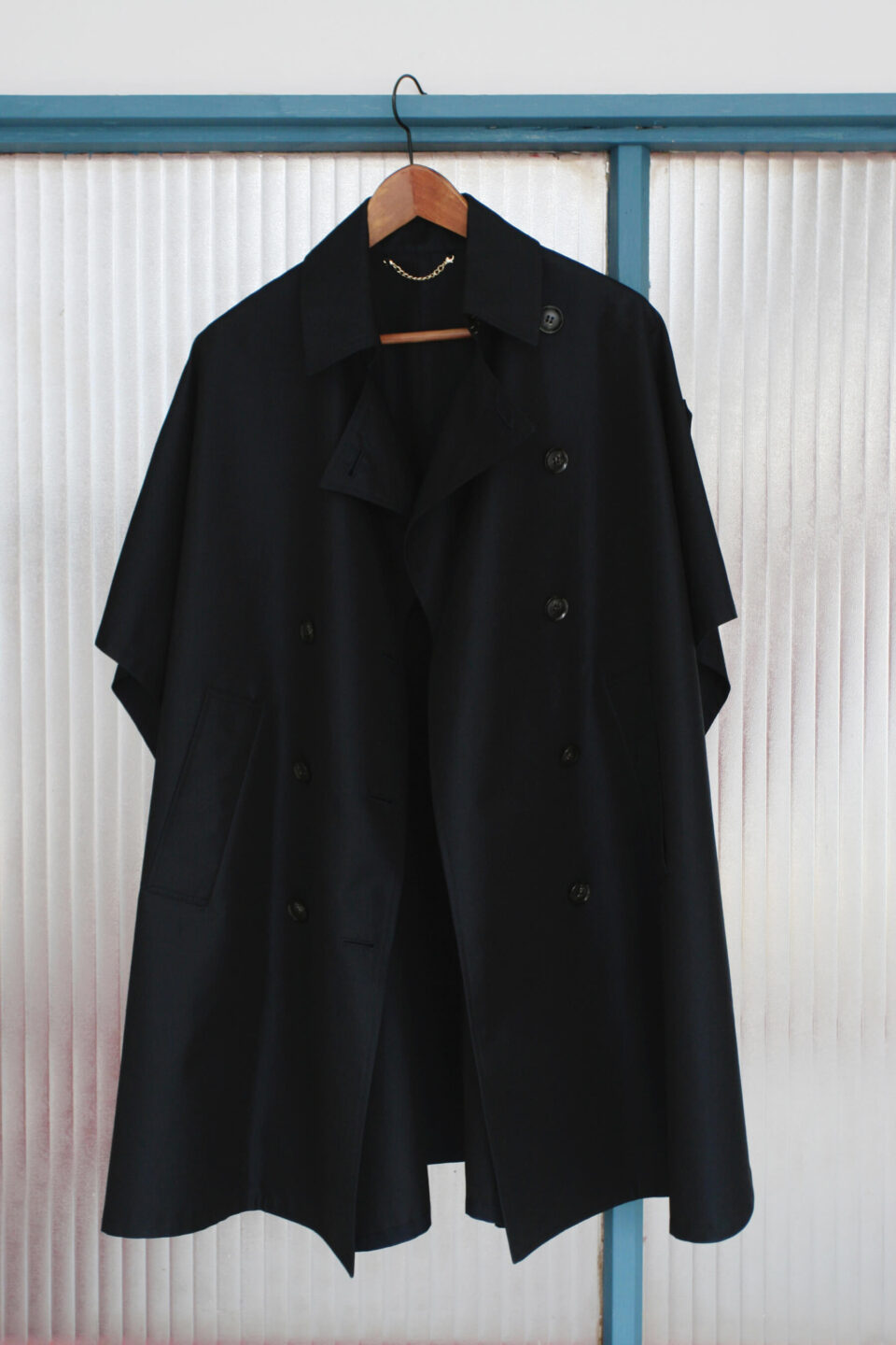 ブルゾンやニットとのレイヤードにも向くケープ型トレンチ。エポレットを残しつつ、フレアなシルエットが華やかな印象を添える。英国老舗ブランドも採用する高級超長綿を使用し、発色と耐久性に優れたスレン染料で染色。長く寄り添ってくれる存在に。95,700円(L’Appartement)
