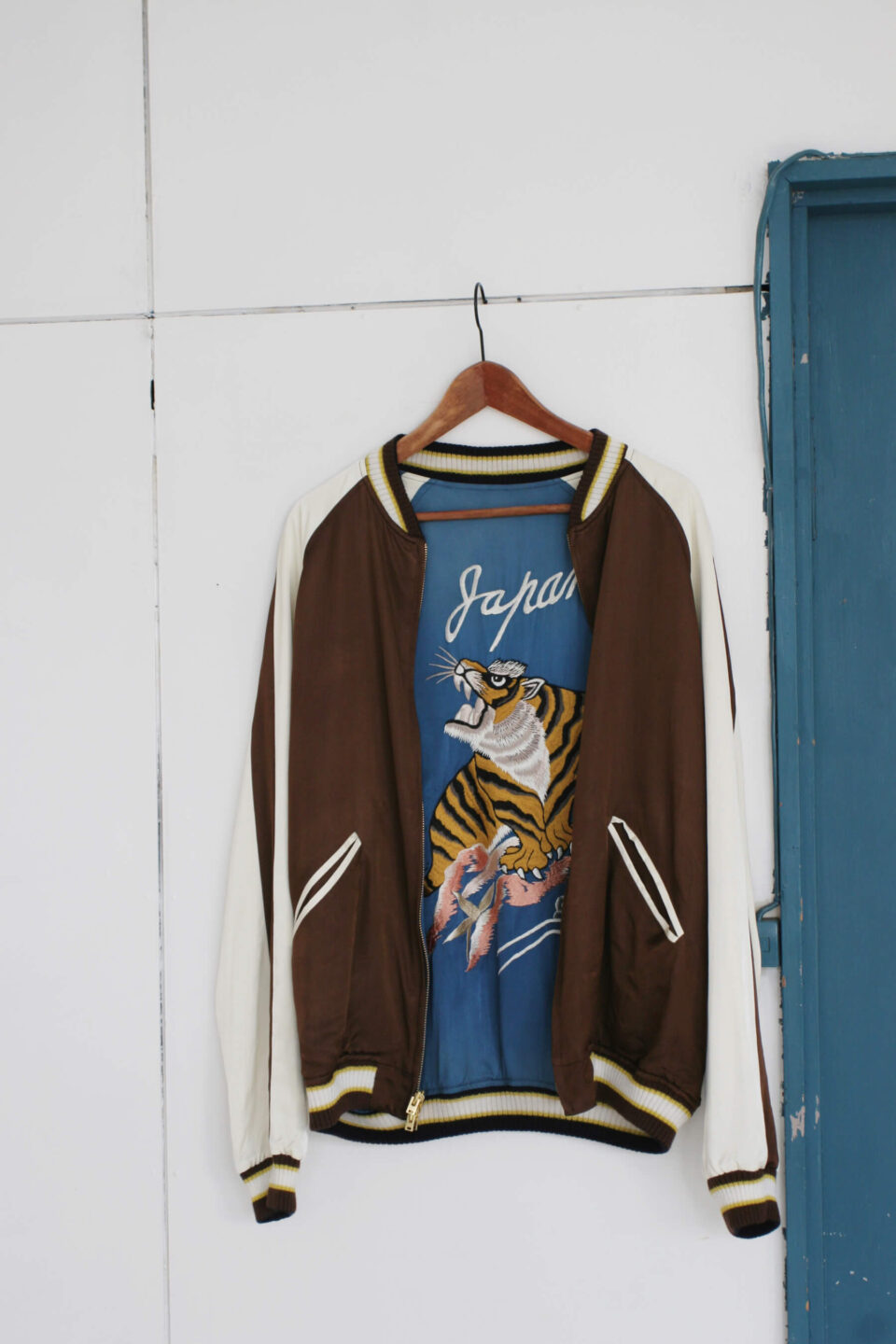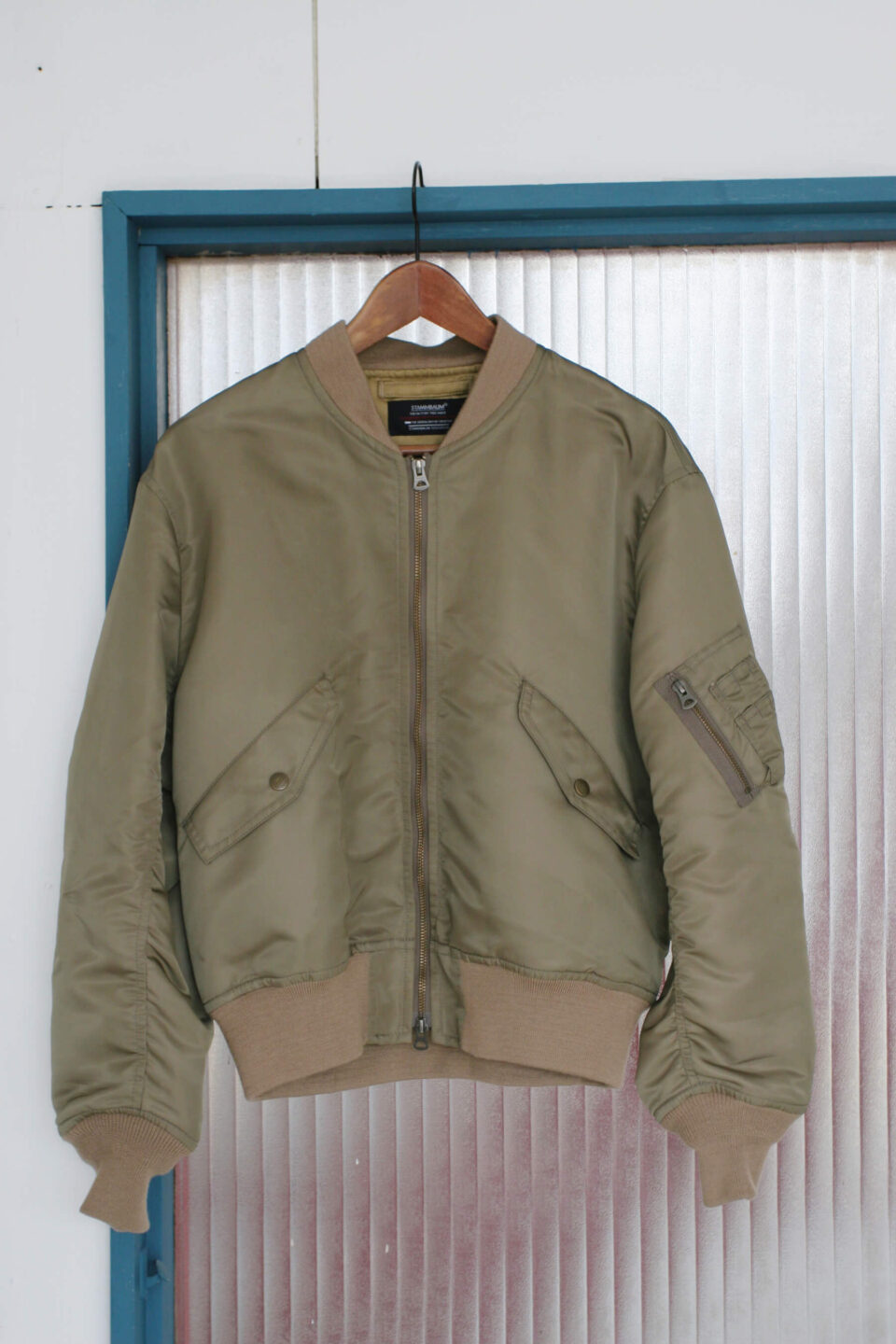 日本製にこだわり、国内にわずかに残る工場や職人と手を組むブランド〈シュタンバウム〉より。原画師によってデザインされた虎柄とブラウンのリバーシブル仕様。シルクレーヨン製のサテン生地のツヤとドレープで上品な仕上がり。165,000円(STAMMBAUM) 1950年代中期〜70年代後半に米軍で採用された、中綿なしの軽量ナイロンフライトジャケット「L2B」がベースとなったデザイン。コンパクトな身丈やエポレットを省いたミニマルな一着。甘さのあるアイテムとも相性抜群。48,400円(Deuxème Classe)