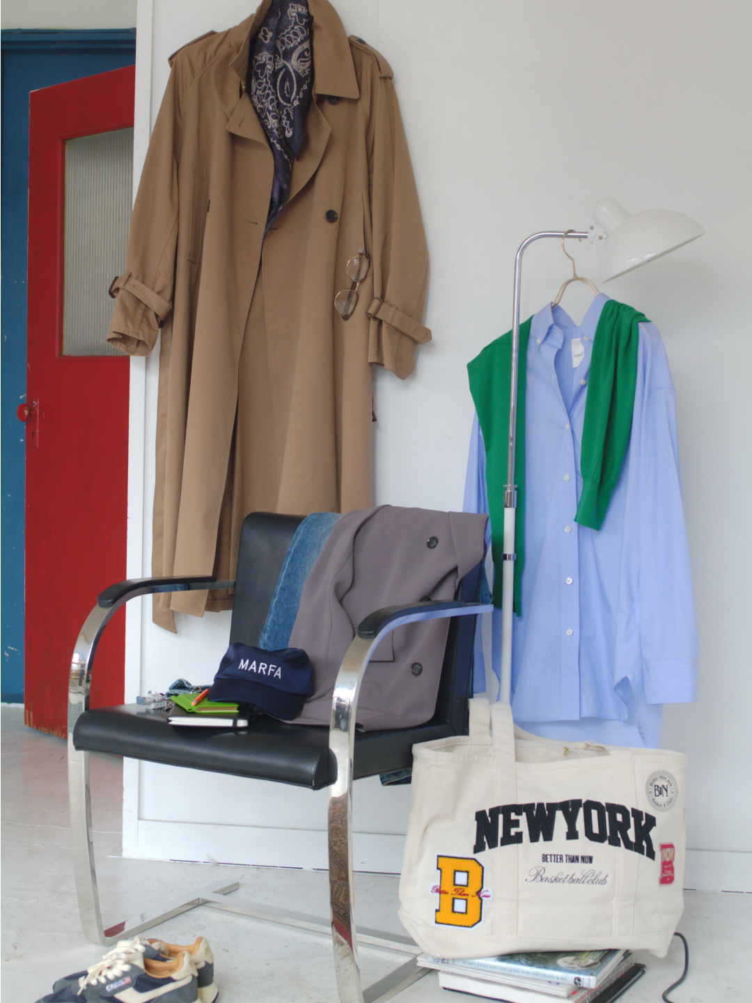 着丈を長めに設定し、淡いベージュが春らしくエレガントなジャケット。キメの細かいダブルクロス素材は適度な厚みとハリがあり、シワになりにくい。69,300円(L’Appartement)スニーカー19,800円(アディダス)