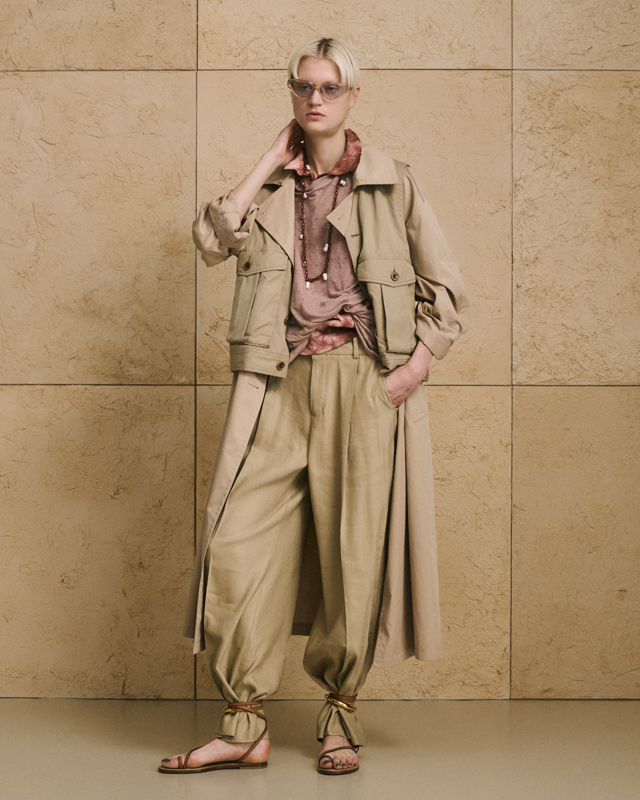 Vest ¥53,900(KATHARINE HAMNETT + THENIME)/ Coat ¥132,000(MINITZ)/ Tops ¥17,600(LAYAS)/ Cut&Sewn<br>¥29,700(raspail)/ Pants / Sunglasses ¥66,000(megane and me)/ Necklace ¥50,600(RAPONESA GENERAL STORE)/ Sandals ¥95,700(AMANU)