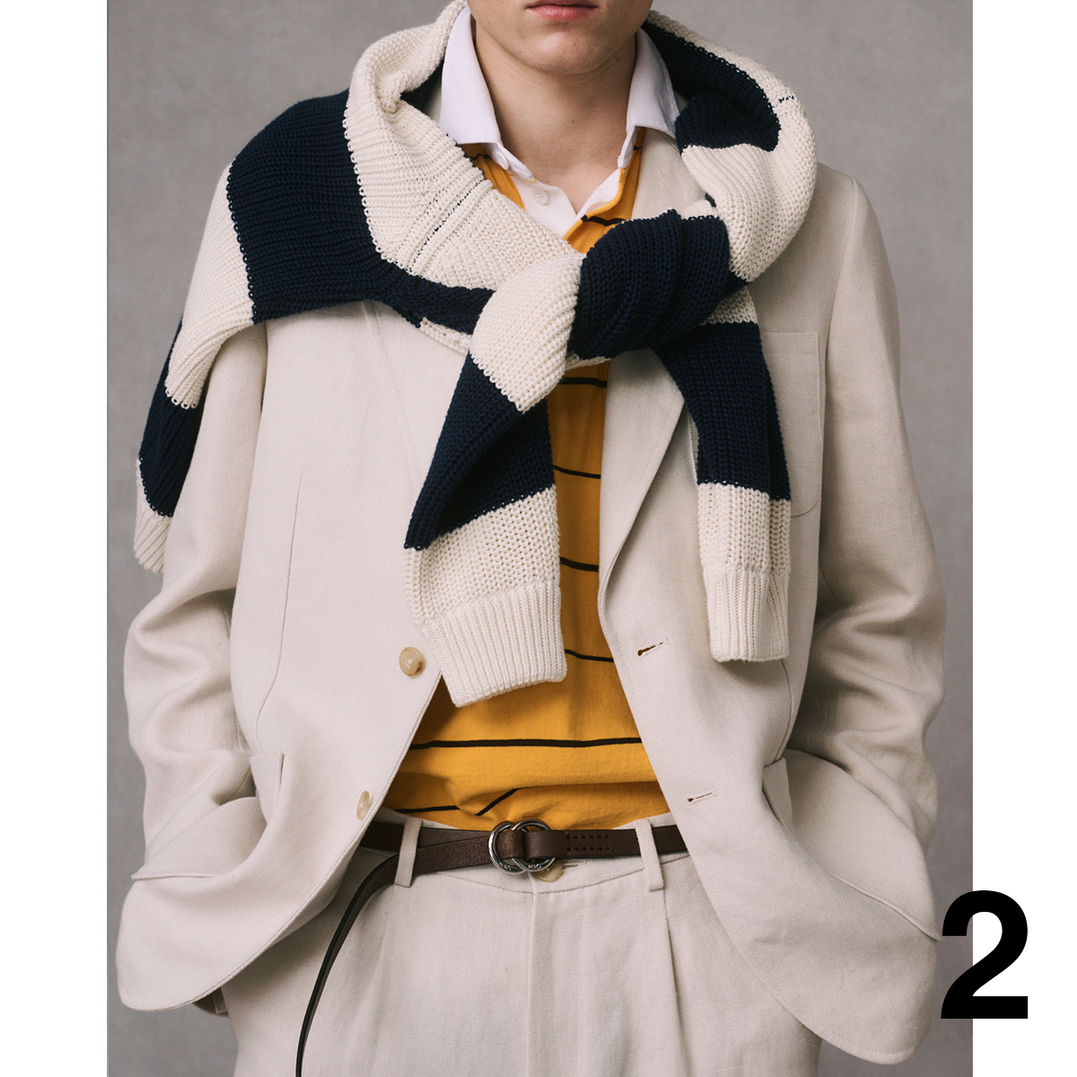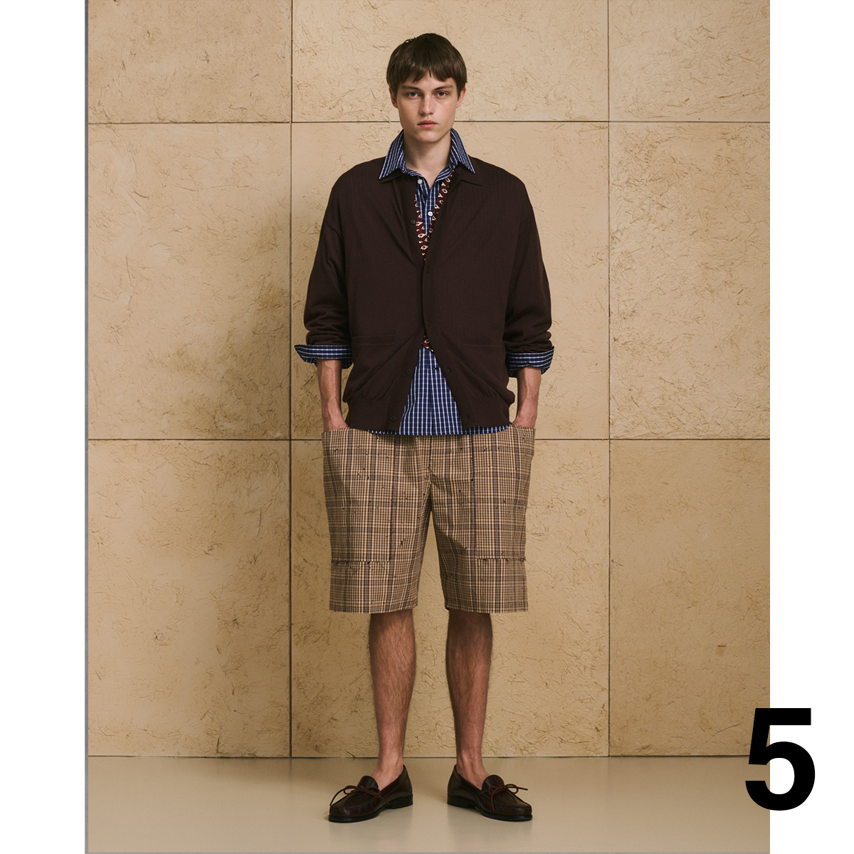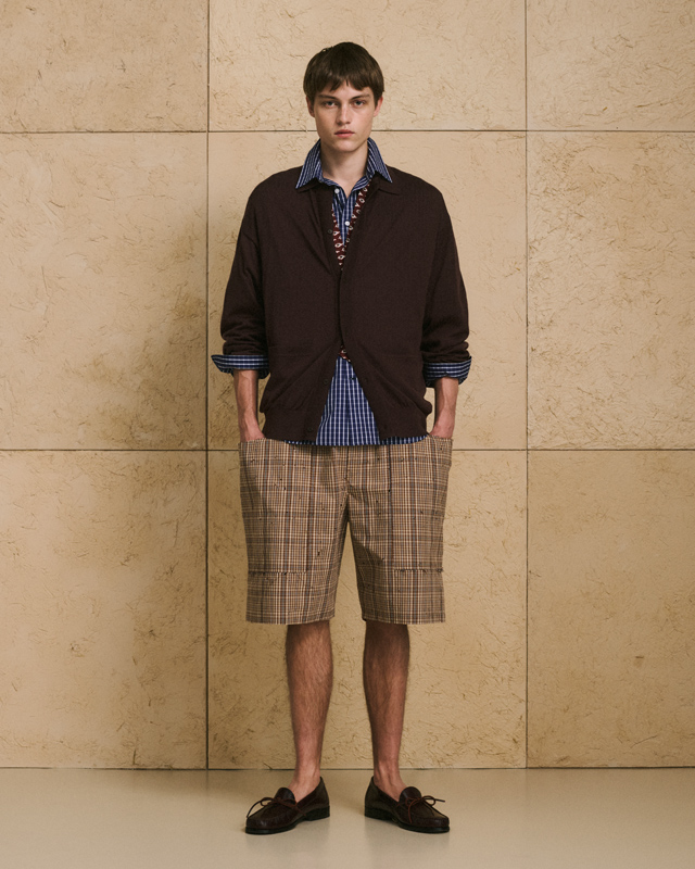 Knit ¥26,400(FOLL)/ Shirt ¥35,200(NOAH)/ Shorts ¥86,900(CLASS)/ Tie ¥22,550(WILLIE TAYLER)/ Shoes ¥47,300(NOAH)