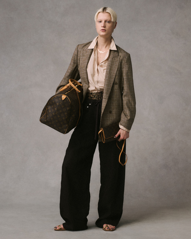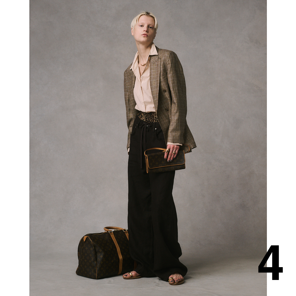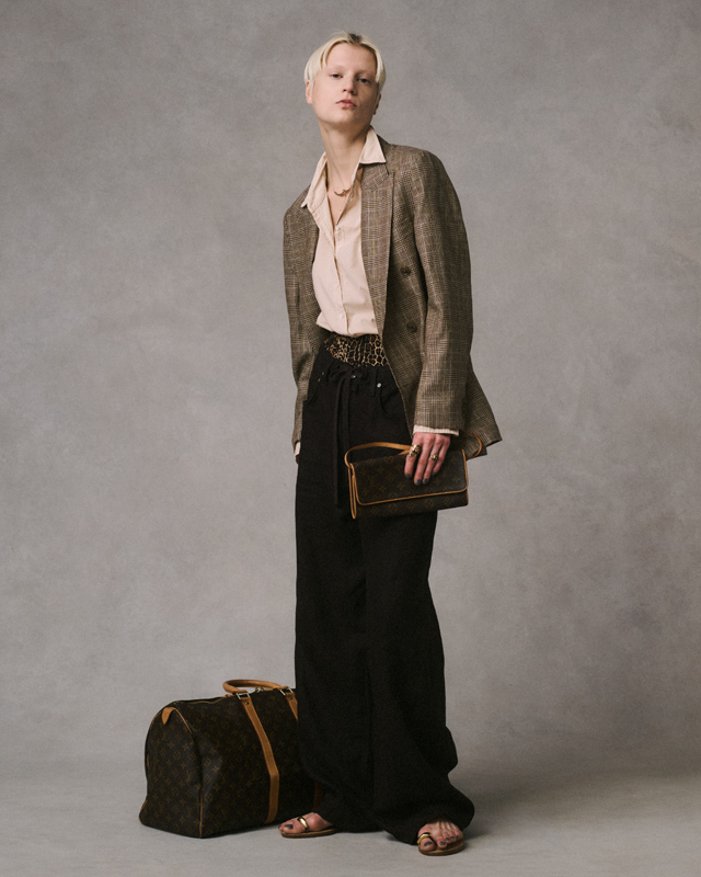 Jacket ¥79,200(COUTURE‘ADAM)/ Shirt ¥36,300(XIRENA)/ Pants ¥57,200(CITIZENS of HUMANITY)/ Pants(leopard) ¥55,000(ANJUNA)/ Necklace ¥495,000(Manon)/ Bag(small) ¥132,000(Vintage LOUIS VUITTON)/ Bag(big) ¥176,000(Vintage LOUIS VUITTON)/ Ring(left) ¥110,000(Vintage)Ring(right up to down) ¥110,000, ¥66,000, ¥110,000(Vintage)/ Sandals ¥121,000(AMANU)