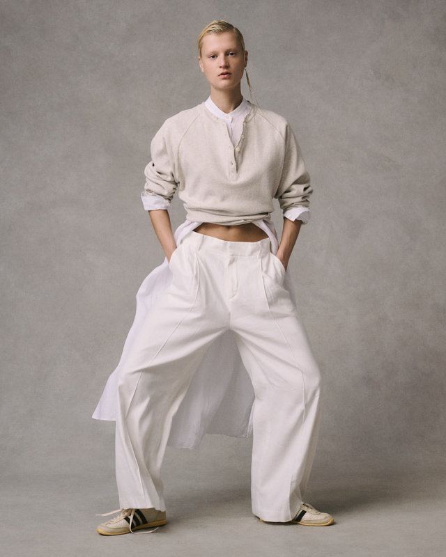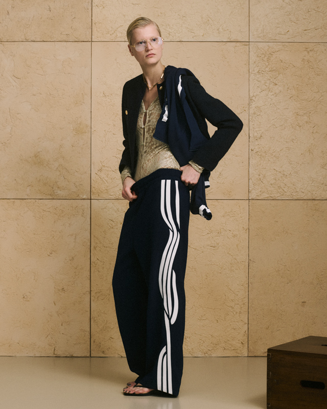Cut & Sewn ¥16,800(REMI RELIEF)/ Dress ¥50,600(Deuxième Classe)/ Pants ¥30,800 (Deuxième Classe) Earring ¥83,600(Jeeyun Ha Designs)/ Shoes ¥18,700(adidas Originals)