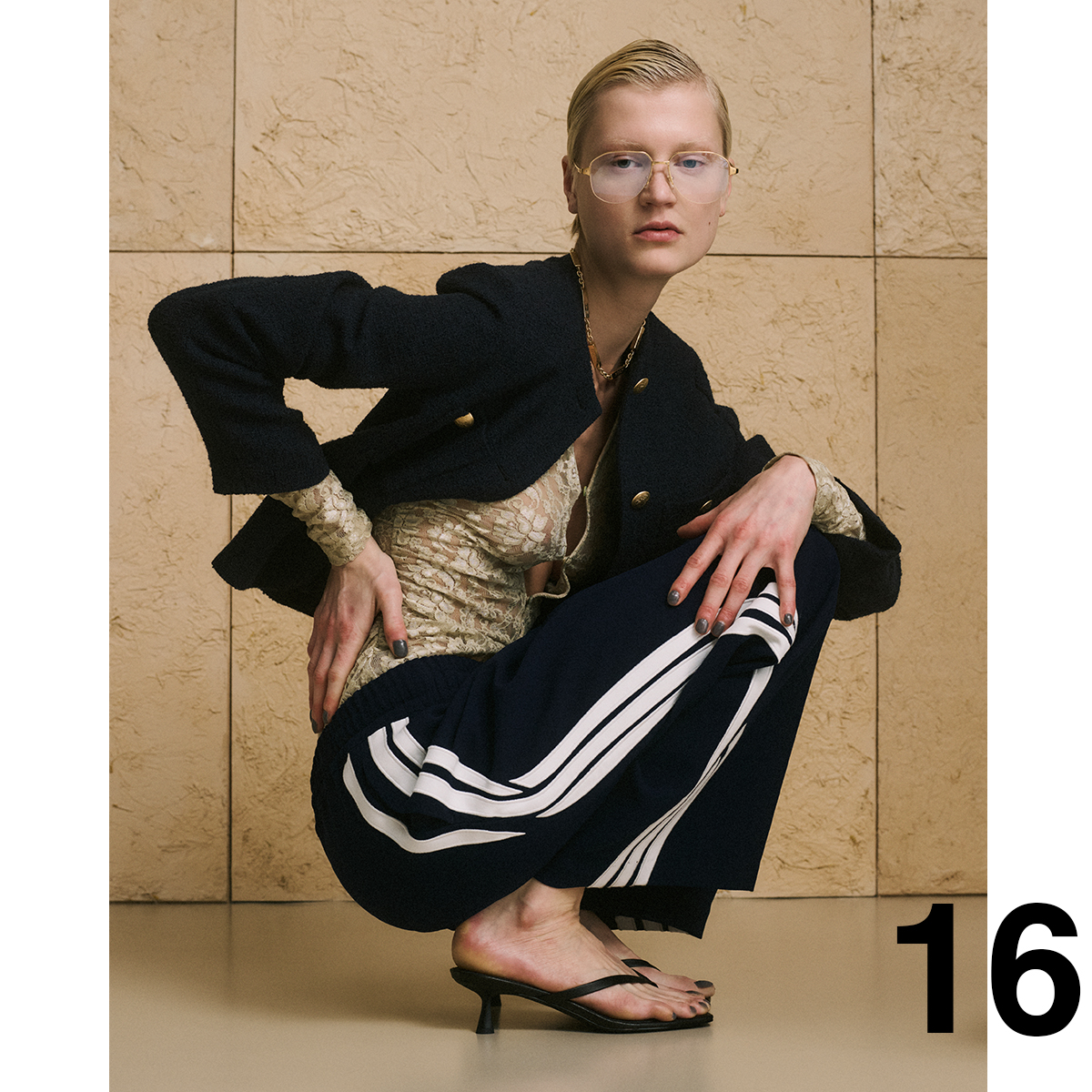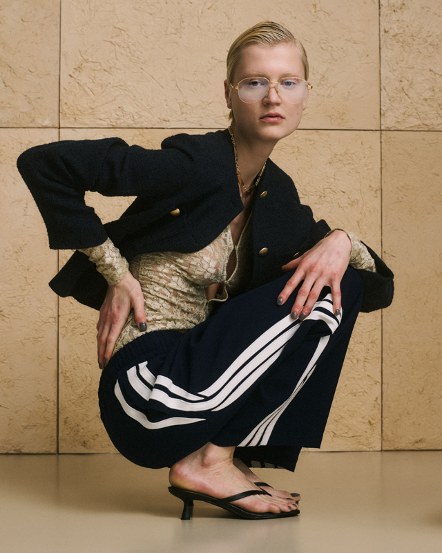 Jacket(Outer)¥79,200(Deuxième Classe)/ Jacket (Inner) ¥30,800(LAYAS)/ Bodysuits ¥42,900(CHIKA KISADA)/ Pants ¥24,200(LAYAS)/ Glasses ¥144,100(Cartier)/ Necklace ¥880,000(LAUREN RUBINSKI)/ Sandals ¥24,200(Mollini)