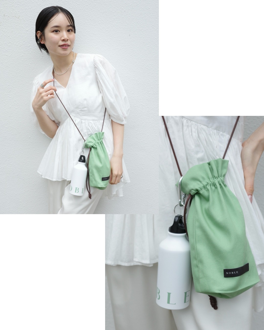 ウォーターボトルにはカラビナも付いているので、BAGにつけても◎巾着はポシェット使いもできるように、長さの調節が可能です。もちろん、ポーチとしてペットボトルのケースにしても!